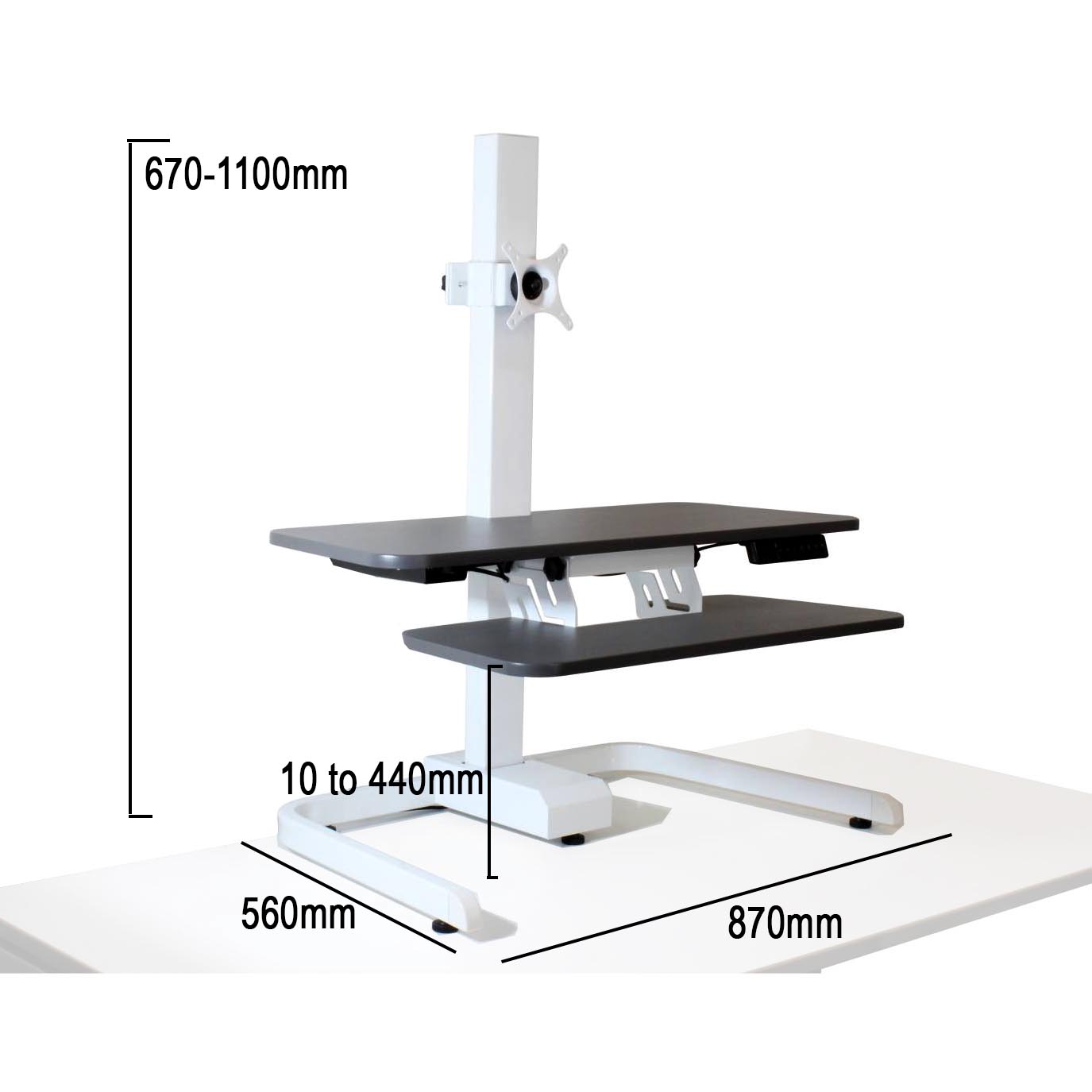 Our Sit to Stand Up Desk can be set to any height between 1cm and 44cm from your desks surface, simply by pressing the up and down arrows. You can store 4 heights in memory, and simply press a button to make the desk smoothly, seemlessly and quickly adjust to that remembered height.